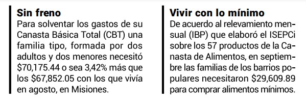 “Para poder solventar los gastos de su Canasta Básica Total (CBT) una familia necesitó $70,175.44 o sea 3,42% más que los $67,852.05 con los que vivía en agosto, en la provincia de Misiones”, dijo a Belén Wagner, directora del Instituto de Investigación Social, Económica y Política Ciudadana (ISEPCi).