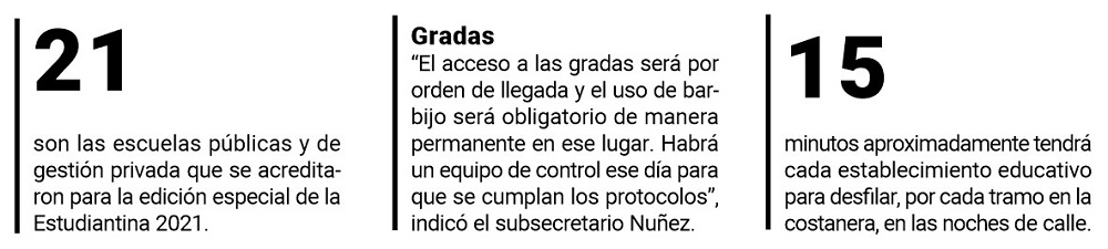 En cuanto al acceso a las gradas, indicó que “será por orden de llegada y el uso de barbijo será obligatorio de manera permanente en ese lugar. Habrá un equipo de control ese día para que se cumplan los protocolos. Lo hemos visto en años anteriores que el público se va renovando, muchos padres y familiares o amigos ven al colegio que les interesa y se van renovando en los lugares”.