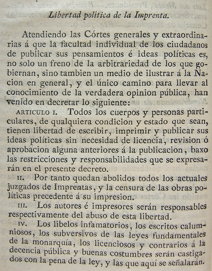 1º Todo hombre puede publicar sus ideas libremente y sin censura previa. Las disposiciones contrarias a esta libertad quedan sin efecto.