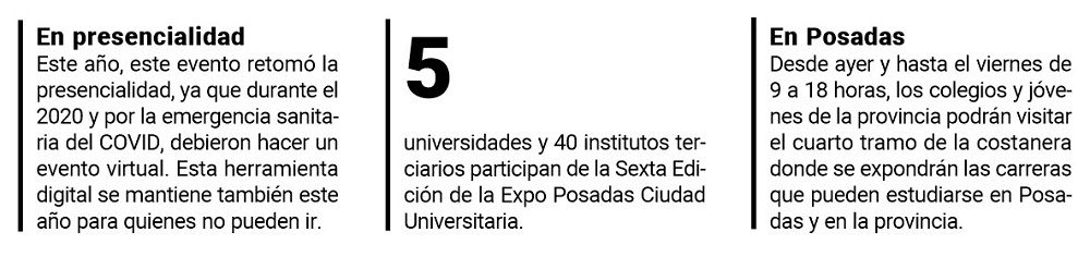 La Expo Posadas Ciudad Universitaria se realizará durante toda esta semana. “Es el primer día, arrancamos desde las 14 horas con la visita de los colegios en los stands. Generalmente son todos los últimos años de las escuelas las que vienen a ver las ofertas académicas”, añadió.