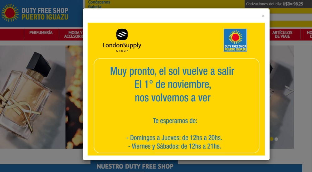 Tras diecinueve meses sin actividades comerciales, ejecutivos de la empresa Zona Franca Puerto Iguazú S.A., que forma parte del holding argentino London Supply Group, confirman la reapertura de su sector minorista, comercialmente conocido como Duty Free Shop Puerto Iguazú, con fecha programada para este 1 de noviembre.