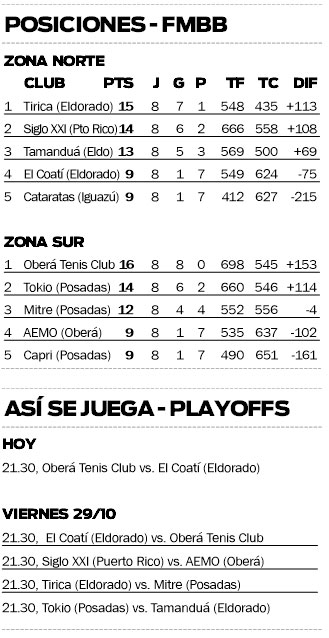 Vale recordar que dicha instancia se abrirá hoy en Oberá, donde OTC, el mejor equipo de la fase regular, será anfitrión de El Coatí de Eldorado desde las 21.30. El segundo punto se desarrollaría en la jornada del viernes en la ABE.