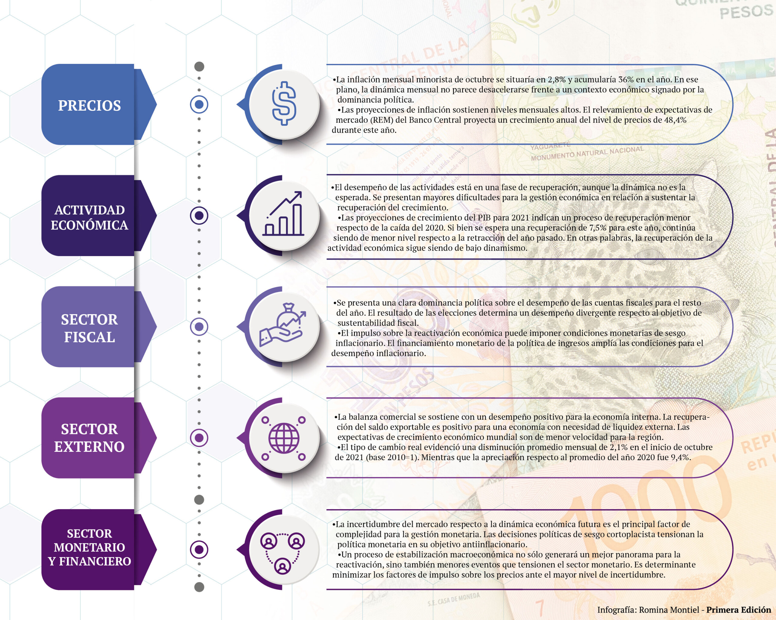 Al final del informe de octubre se compartió, punto por punto, el análisis del economista Calveira sobre precios, actividad económica y sector fiscal, externo y monetario.