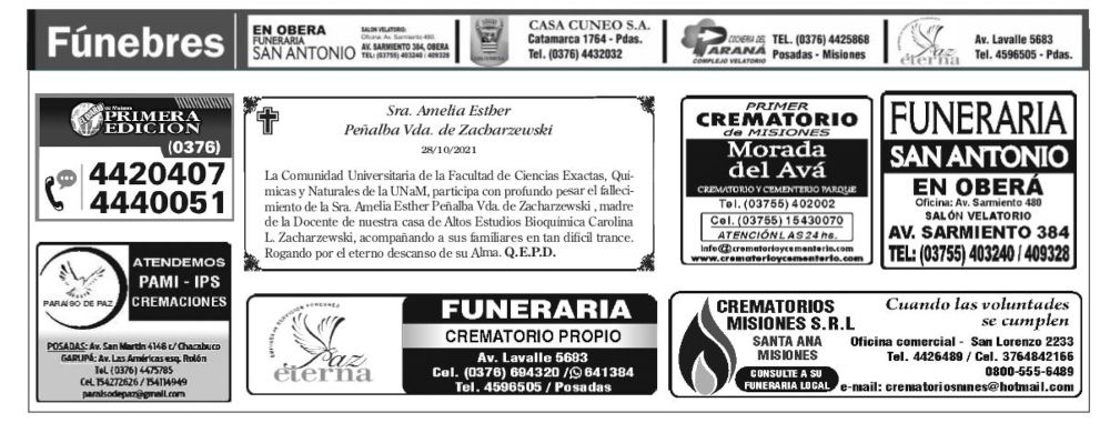 Fúnebres del lunes 1 de noviembre de 2021