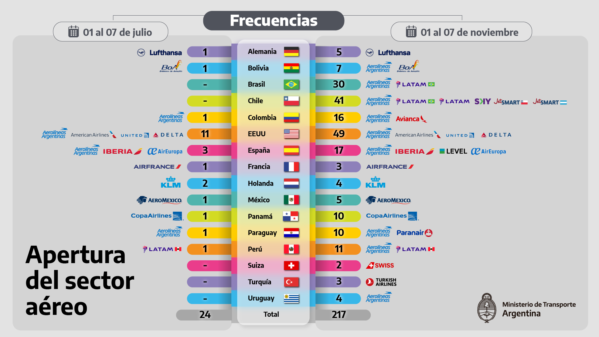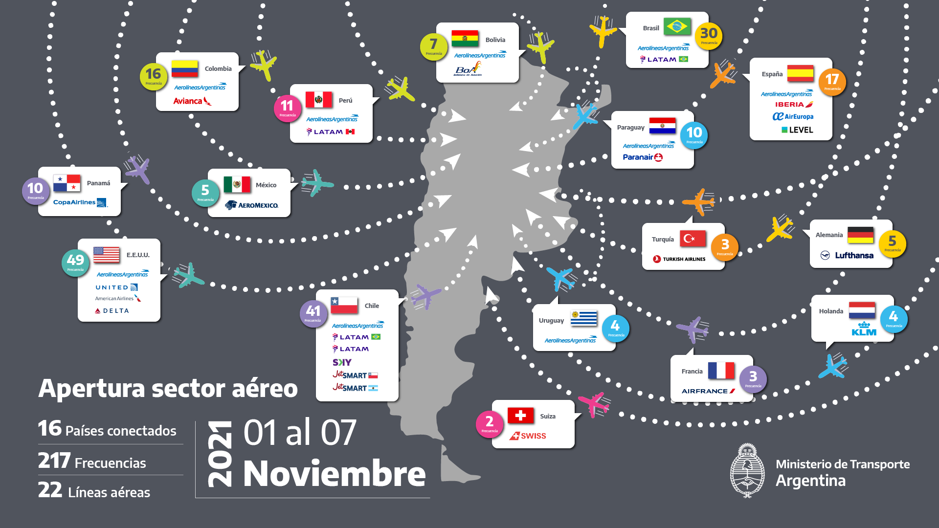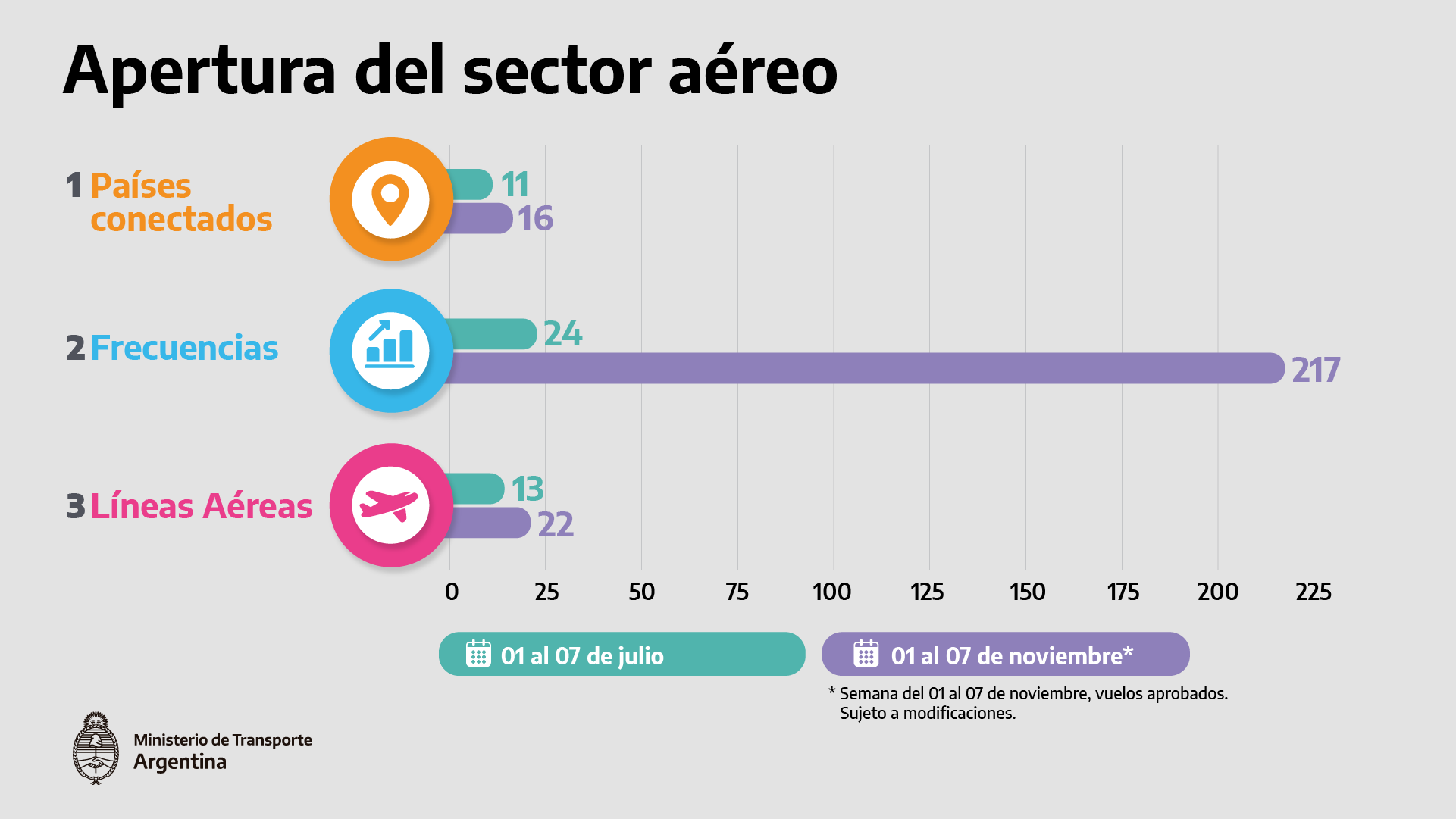 Tras las flexibilizaciones en el transporte aéreo y la reapertura del ingreso de extranjeros y turistas al país, el Ministerio de Transporte registró que en la primera semana de noviembre se produjeron los arribos de 217 vuelos provenientes del exterior. Esa cifra supera ampliamente los 24 vuelos semanales de la primera semana de julio, momento en que estaban en vigencia mayores restricciones a las aerolíneas.