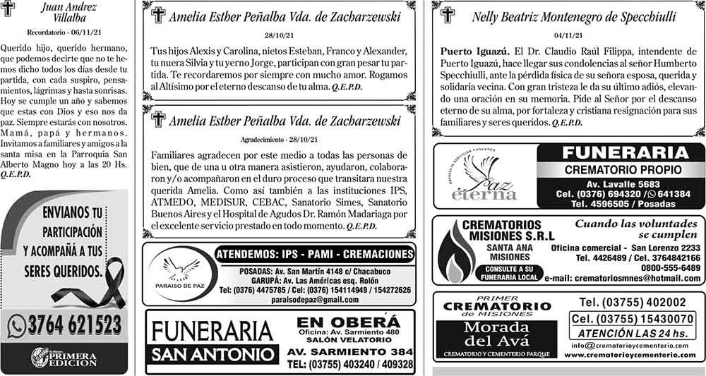 Fúnebres del sábado 6 de noviembre de 2021