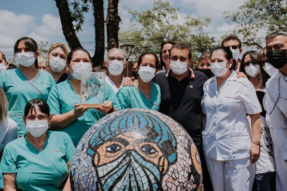 Este fin de semana, en la plaza central de San Vicente se homenajeó a trabajadores de distintos sectores por su esfuerzo y compromiso en tiempos de pandemia. El gobernador Oscar Herrera Ahuad fue el encargado de descubrir una esfera confeccionada en mosaicos y entregó placas de vitrofusión realizadas por el taller Artes del Fuego del Parque del Conocimiento.
