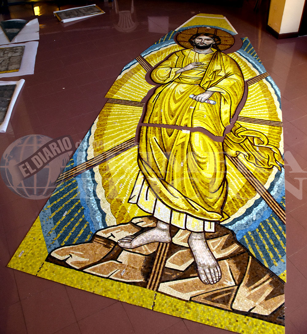 Una de las especializaciones de Costantini es trabajar sobre mosaico sacro, y bizantino, sobre todo. “Presentado el boceto que tenía que reproducir, lo primero que hice fue la elección de los colores para las vestes, para la ropa del Cristo, color piel para las manos y el rostro, y para la almendra que lo rodea. Así fuimos avanzando y armando este gran mosaico”, contó.