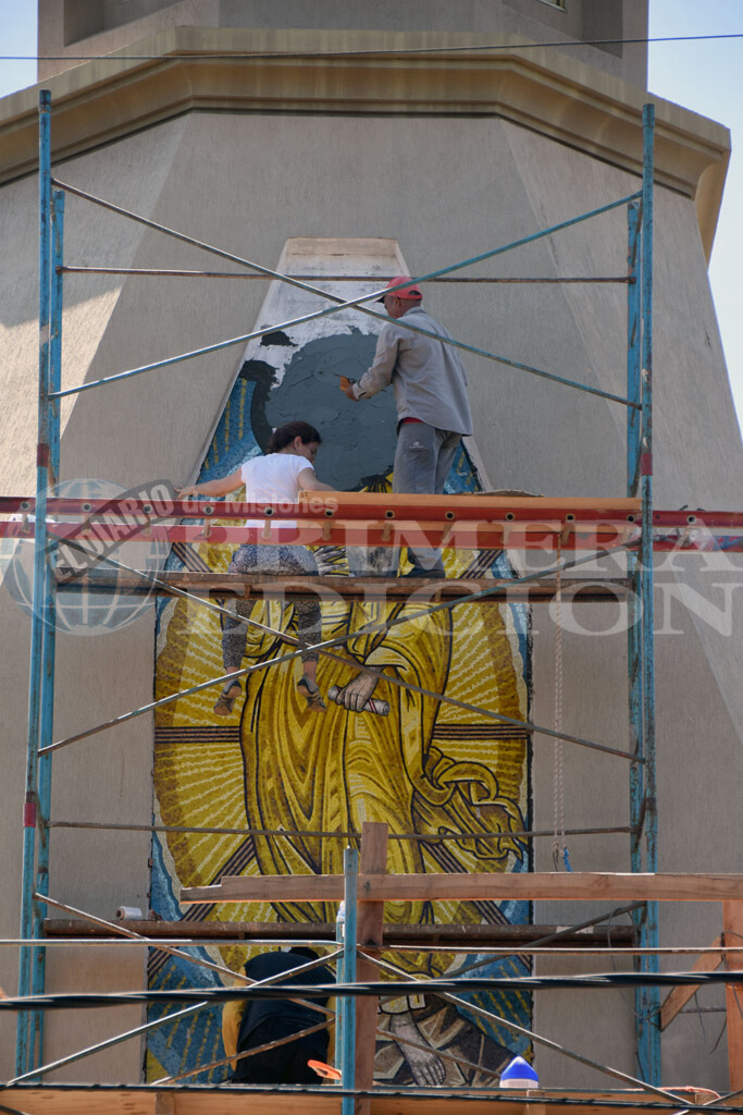 Zimmer lo convocó a raíz de los trabajos que se hicieron y que el sacerdote pudo observar. Debía ser un mosaico, por la perdurabilidad y porque es lo más apto para el exterior. “No se puede comparar con una mayólica, con una impresión, ni con una pintura. Todas esas expresiones o esas materialidades tienen la dificultad que con el tiempo se deterioran. En cambio, éste no. De hecho, hay iconos bizantinos que llegaron a nuestros días desde Bizancio bien conservados, entonces es un buen ejemplo”, completó.
