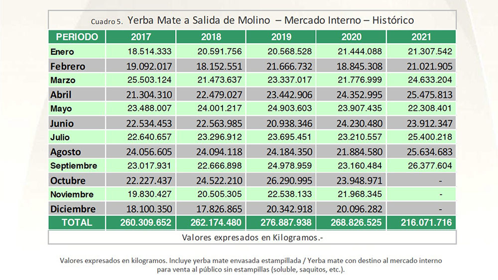 Los datos estadísticos registrados por el Instituto revelan que durante el mes de septiembre el volumen de yerba mate elaborada a salida de molino alcanzó los 26.377.604 kilos, lo que sumado a los meses anteriores, el consumo interno acumula 216.071.716 kilos entre enero y septiembre.