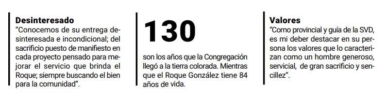 “Conocemos de su entrega desinteresada e incondicional; del sacrificio puesto de manifiesto en cada proyecto pensado para mejorar el servicio que brinda el Roque; siempre buscando el bien para la comunidad. Esforzándose por cumplir rigurosamente con sus deberes, sin olvidar la promoción y acompañamiento de obras solidarias, estimulando a toda la comunidad, y no solamente a los alumnos, en la puesta en marcha de las mismas; teniendo presente que la única y verdadera razón de la tarea educativa, son los estudiantes; respondiendo siempre en forma efectiva, a las nuevas tendencias a las que la sociedad de hoy nos desafía”, afirmó el máximo referente de la SVD.