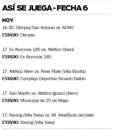 También desde las 17 se jugarán los otros dos choques del día: en 25 de Mayo, San Martín recibirá a un entonado Atlético Iguazú, que suma dos triunfos y quiere más; mientras que en Villa Svea, Racing tendrá el duro desafío de chocar con Aristóbulo, escolta de Exa.