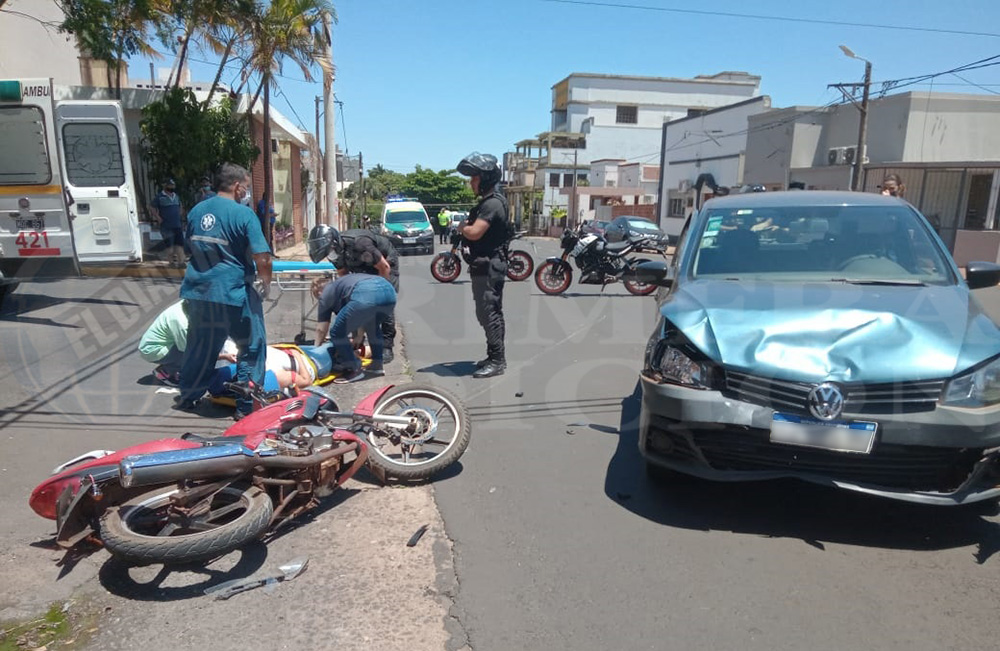 Pasado el mediodía de este sábado, una motocicleta y una automóvil protagonizaron un fuerte choque en la intersección de las calles Santa Fe y Junín de Posadas.