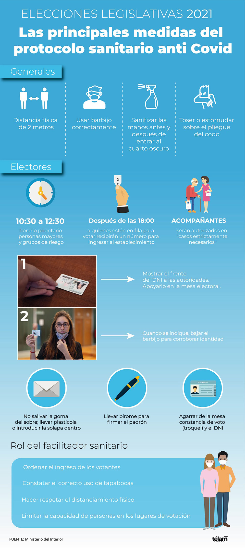 Los argentinos concurrirán este domingo a votar en las elecciones legislativas nacionales con el protocolo sanitario por la pandemia de coronavirus que mantendrá las medidas de cuidados preventivos implementadas en las PASO para evitar contagios, pero será más flexible en la organización del proceso comicial con el objetivo de evitar demoras a la hora de sufragar.