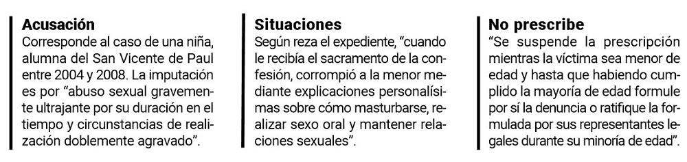 Para el magistrado, con las pruebas recabadas se pudo acreditar que aproximadamente entre el 2004 y el 2008, el párroco que “se desempeñaba como capellán de la Unidad Educativa ‘Monseñor Lodigiani’ -Colegio San Vicente de Paúl- ubicada en 115 número 566 de La Plata, abusó sexualmente de una menor de 11 años al inicio de los actos, a quien hacía colocar sus manos en los bolsillos de la sotana y sentir su pene erecto, situaciones que acaecían en el patio de la institución y durante los recreos”.