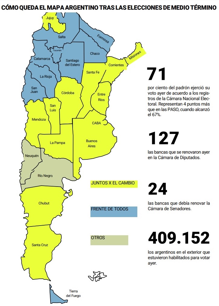 Por su parte, el oficialismo no logró su objetivo de dar vuelta resultados para lograr mantener la mayoría en la Cámara alta y una posición privilegiada en Diputados, aunque sí pudo recortar la diferencia en Buenos Aires.