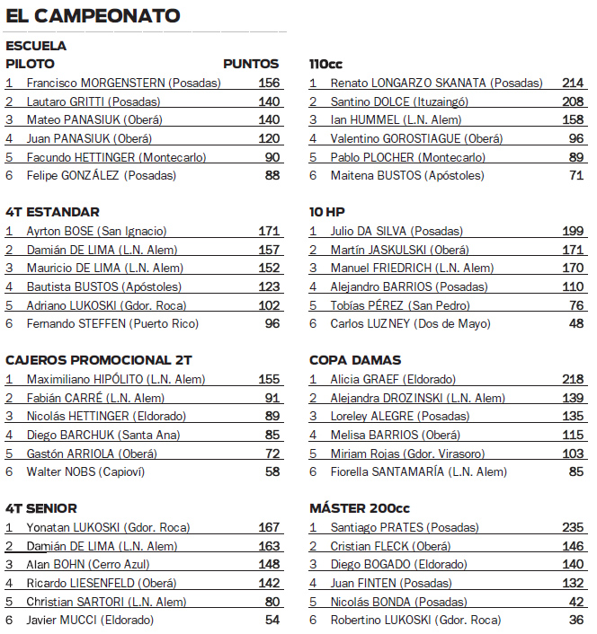 Diferente es la situación en las otras seis categorías. En la 4T Estándar, la más potente, Ayrton Bose lidera con 171 puntos, pero debe sumar en la última para coronarse. Es que Damián y Mauricio De Lima le pisan los talones.