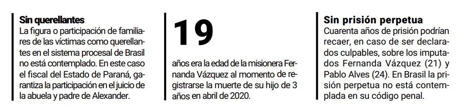 De acuerdo a la ley penal brasileña, la madre de Alexander Figueredo podrá ser juzgada porque su condición no es de desaparecida para la Justicia, sino que permanece en calidad de prófuga y sería acusada de la misma manera que el padrastro de la víctima fatal. La abogada misionera Blanca Núñez representa los derechos de la abuela y padre del niño, Gloria García y Damián Figueredo.