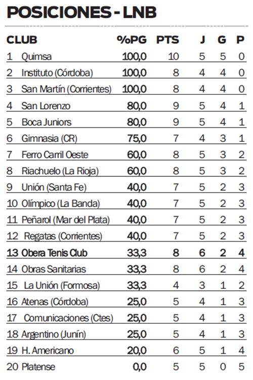 La primera victoria de Oberá Tenis Club en el estadio Luis Augusto Derna llegó de manera abrumadora y hoy, otra vez de local, intentará aprovechar ese impulso para buscar un nuevo triunfo que lo haga despegar de una vez por todas en la Liga Nacional de Básquetbol.