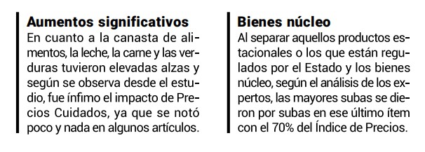 En lo que tiene que ver con la CBT, los mayores aumentos se registraron en los rubros prendas de vestir y calzados con el 6,9% seguido por el rubro restoranes y hoteles que subieron un 4,9%. El transporte también mostró subas con el 4% y recreación y cultura 3,8%.
