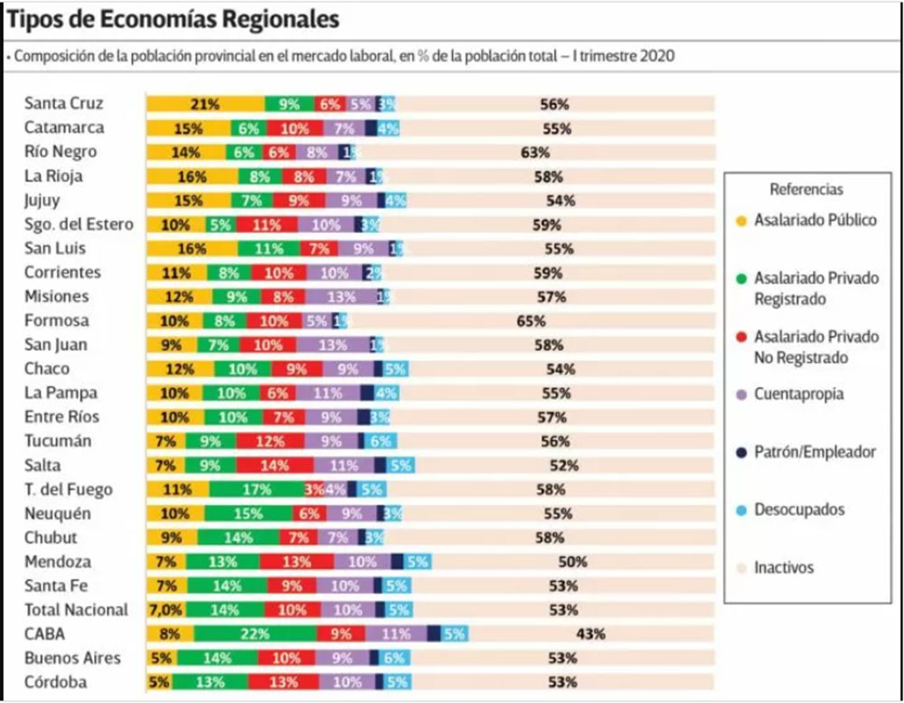 De acuerdo al cuadro, la provincia gobernada por Oscar Herrera Ahuad suma 13% de cuentapropistas, 12% de asalariados públicos registrados, 9% de asalariados privados registrados, 8% de asalariados privados no registrados y 57% de población económicamente inactiva.
