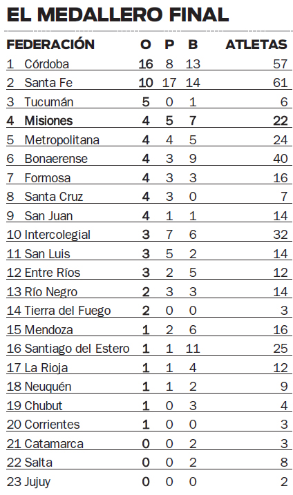 Una notable labor fue la que cumplieron durante el último fin de semana los atletas que representaron a la Federación Misionera de Judo (FMJ) en el Nacional que se disputó en Villa Carlos Paz, Córdoba. Allí, el representativo de la tierra colorada finalizó en el cuatro puesto del medallero general, sobre 23 federaciones. Todo un logro.