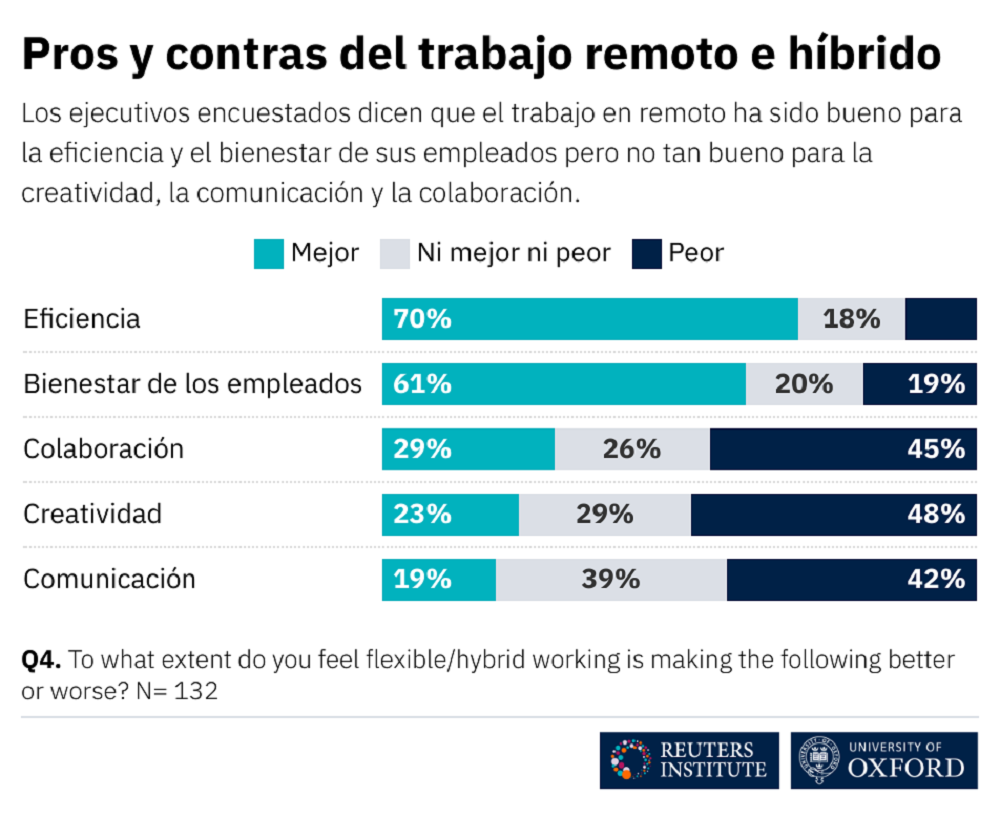 Un informe del Reuters Institute titulado “Redacciones Cambiantes 2021”, basado en una encuesta a 132 ejecutivos que cumplen funciones en medios de 42 países más una serie de entrevistas en profundidad, concluye, entre otras cosas, que el “trabajo híbrido” pronto será la norma para una gran mayoría de los periodistas: algunos estarán en la redacción y otros, en remoto.