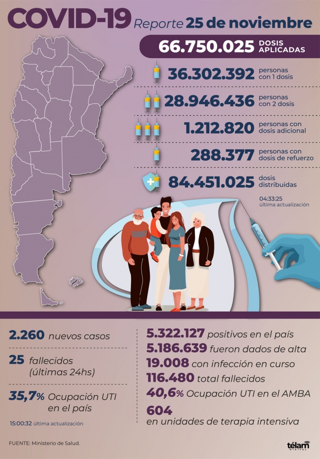 Otras 25 personas murieron y 2.260 fueron reportadas con coronavirus en las últimas 24 horas en la Argentina, con lo que suman 116.480 los fallecidos registrados oficialmente a nivel nacional y 5.322.127 los contagiados desde el inicio de la pandemia, informó hoy el Ministerio de Salud. El parte precisó que murieron 17 hombres y 7 mujeres. Además, la ciudad de Buenos Aires reportó una muerte sin registrar datos de sexo.