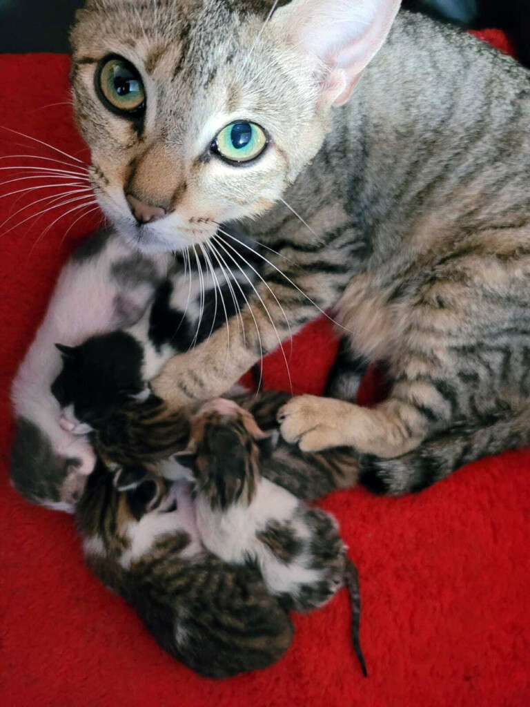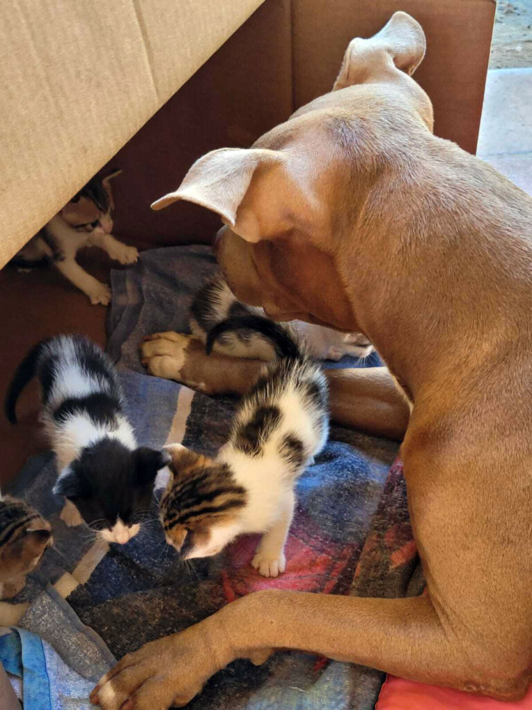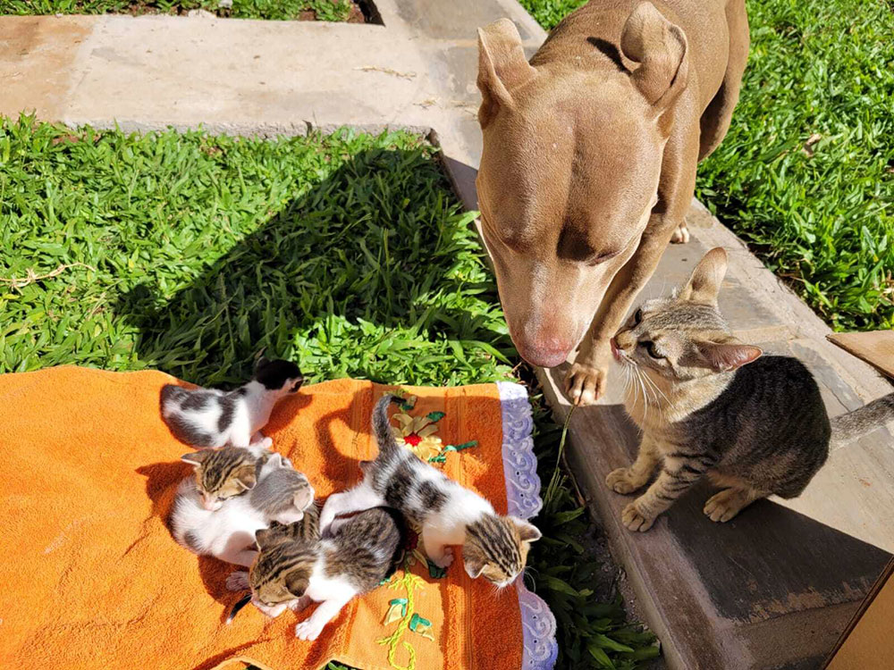 Tal es así que llegó el día y comenzaron a nacer los gatitos, “ella me lloró como diciendo: ‘¡mirá!, qué es ¡esto!’, sorprendida y asustada. Tan chiquita ella. Así llegaron 5 gatitos. Crecieron y lo llevé en la caja afuera y la volqué para que comiencen a caminar y ¡qué pasó! Los vio Limón, la pitbull que primero se sentó a mirarlos desde lejos, luego metió la cabeza adentro de la caja. Fue tan tierno verla, comenzó a lamerlos y mimarlos. Creemos que ella cree que son suyos porque cuando la mamá Catalina quiso acercarse no la dejó”.