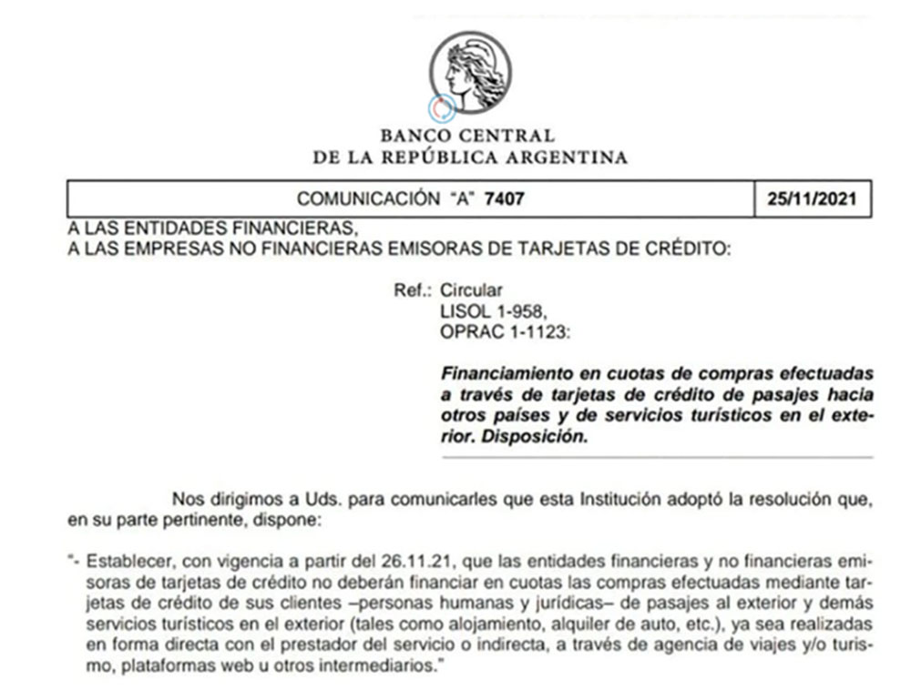 “Establecer con vigencia a partir del 26.11.21, que las entidades financieras y no financieras emisoras de tarjetas de crédito no deberán financiar en cuotas las compras efectuadas mediante tarjetas de crédito de sus clientes –personas humanas y jurídicas- de pasajes al exterior y demás servicios turísticos en el exterior (tales como alojamiento, alquiler de auto, etc.). ya sea realizadas en forma directa con el prestador del servicio o indirecta, a través de agencia de viajes y/o turismo, plataformas web u otros intermediarios”, señaló la norma del Central conocida hoy.