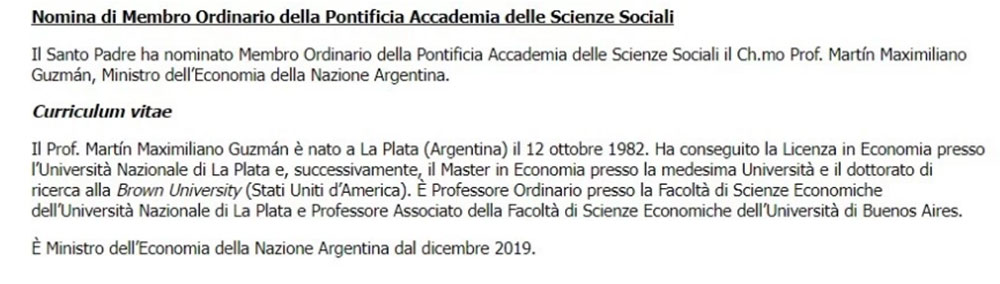 El Vaticano destacó en el currículum de Guzmán que es Licenciado en Economía por la Universidad Nacional de La Plata, con un Doctorado en la Universidad estadounidense de Brown y un posdoctorado en la de Columbia, también en el país norteamericano.