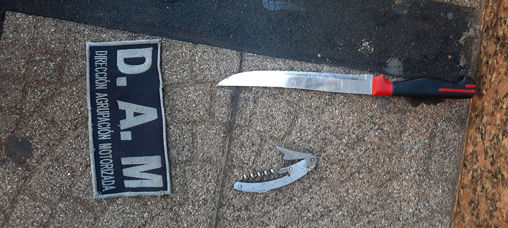 En el lugar de aprehensión de los sospechosos, frente a un local de cobro de servicios y teléfonos públicos, integrantes de la Dirección Policía Científica secuestraron el cuchillo de larga hoja y un sacacorchos, que serán peritados. Según testigos, el cuchillo es similar al que habría utilizado el asaltante para amedrentar a los estudiantes, pero que se le cayó en el forcejeo que se desató.