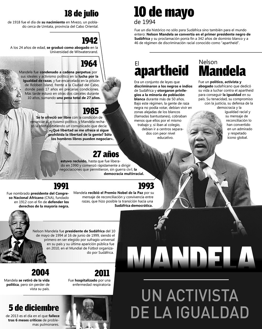 Un día como hoy, en 2013, falleció en Johannesburgo (Sudáfrica) Nelson Rolihlahla Mandela, una de las figuras más importantes de la lucha por la igualdad. Fue un activista político y de los derechos humanos, y luchó incansablemente contra el Apartheid.