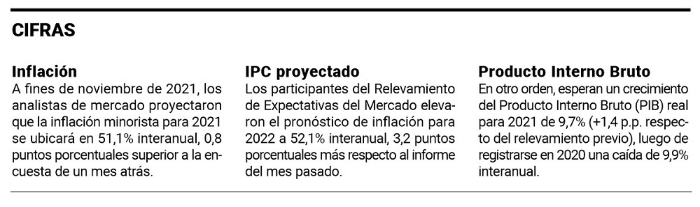 Los participantes del REM previeron también que la inflación de noviembre ascendió al 3,1%. Además, los analistas del mercado proyectaron que la inflación minorista se ubicará a fin de año en torno al 51,1% interanual. Asimismo, el pronóstico de inflación para el año 2022 es de 52,1%.