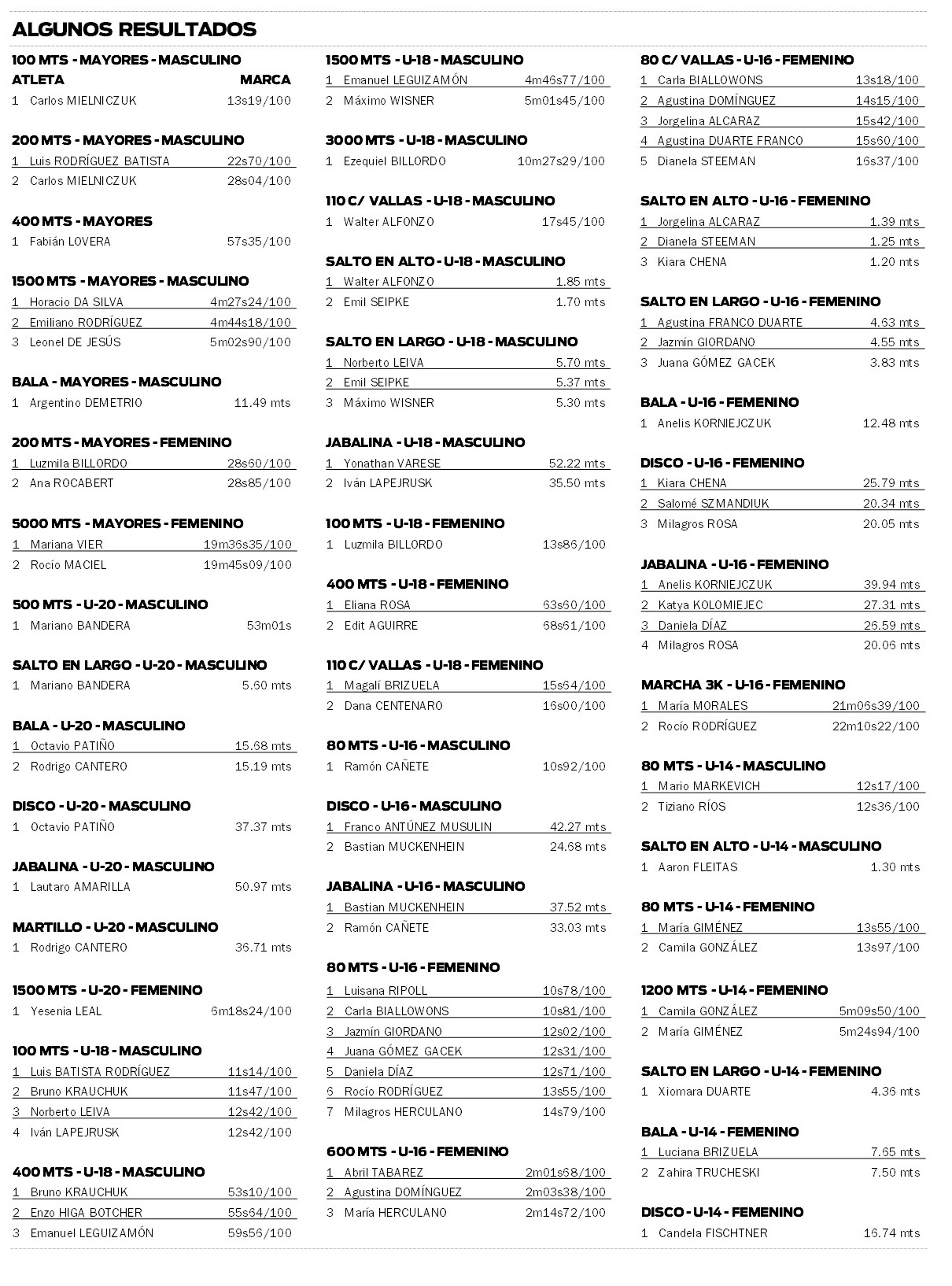 Es así que, con una sonrisa en el rostro, la familia del atletismo misionero se reunió para despedir un año que quedará en la historia. Y ayer en la pista volvieron a destacarse figuras como Lautaro Amarilla en jabalina, Magalí Brizuela en los 110 metros con vallas, Anelis Korniejczuk en lanzamiento, Yony Varese también en jabalina y Luisana Ripoll, en los 80 metros de la categoría U-16. Todos ellos ratifican el rumbo del atletismo misionero, en crecimiento de cara al futuro.
