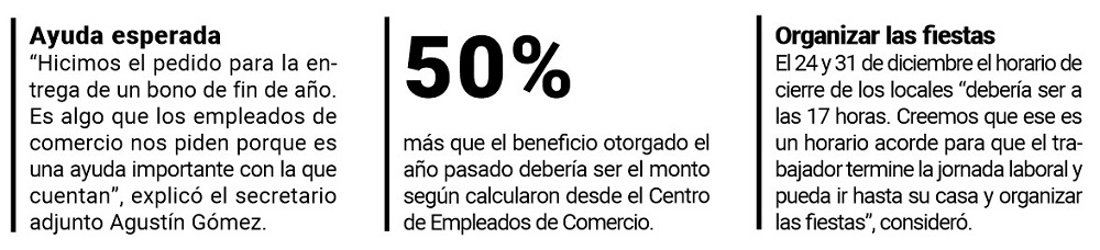 Además, plantearon que el horario de cierre de los comercios debería ser a las 17 el 24 y 31 de este mes para que cada trabajador tenga tiempo de disfrutar de las fiestas navideñas con sus familias.