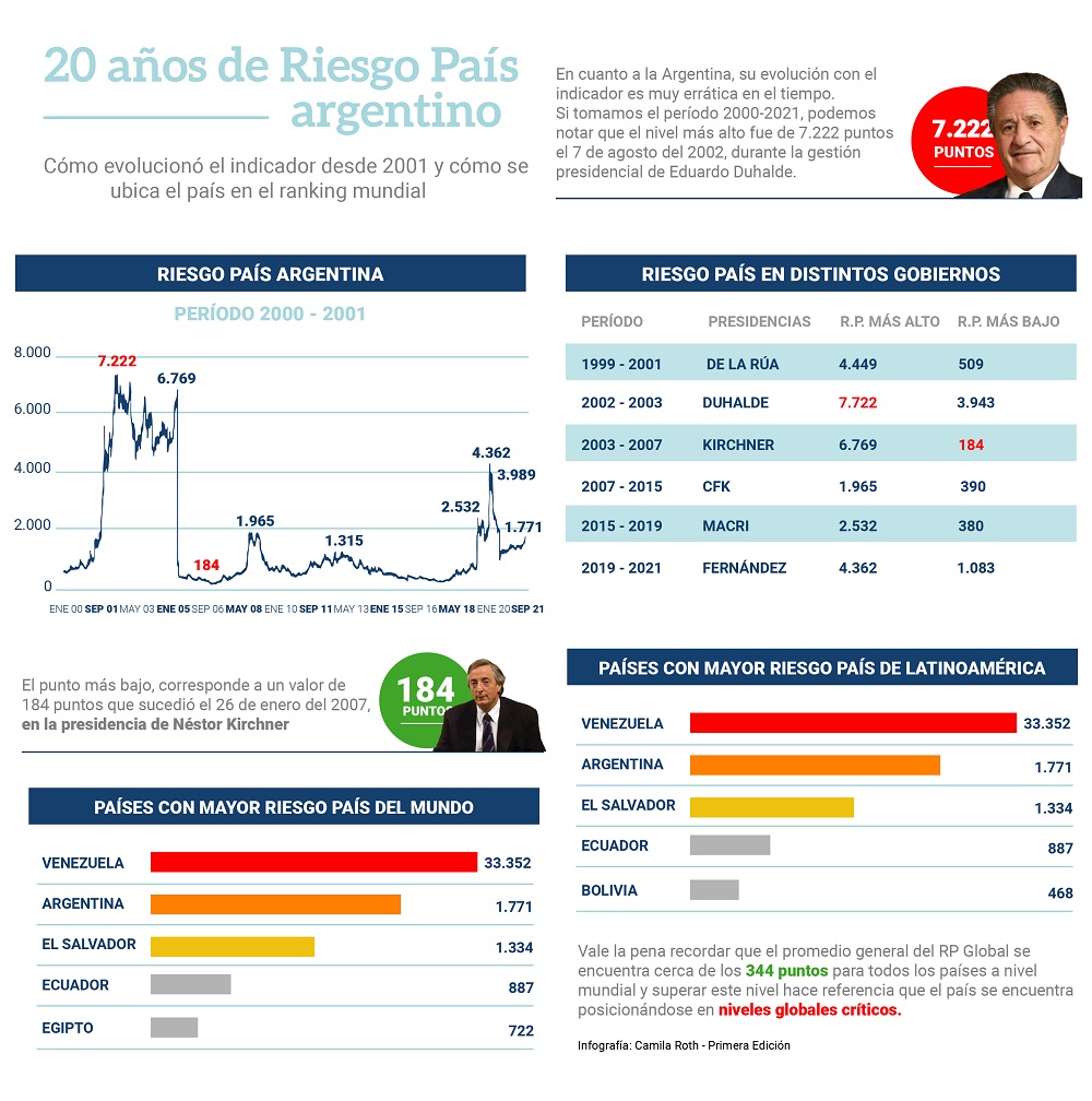 En cuanto a la Argentina, su evolución con el indicador es muy errática en el tiempo. Si tomamos el período 2000-2021, podemos notar que el nivel más alto fue de 7.222 puntos el 7 de agosto del 2002, durante la gestión presidencial de Eduardo Duhalde. Se llegó a ese récord a partir del mega-default anunciado por el expresidente Adolfo Rodríguez Saá en un contexto de la salida de la convertibilidad.