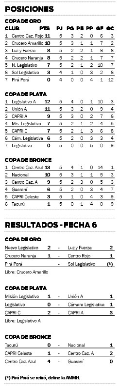 En la de Plata, Legislativo A sigue como líder, seguido por Unión A, que empató ante Legislativo, y CAPRI A en la tercera posición que derrotó a CAPRI C por 3-2. En el otro partido del grupo, Cámara venció a Legislativo por 1-0.