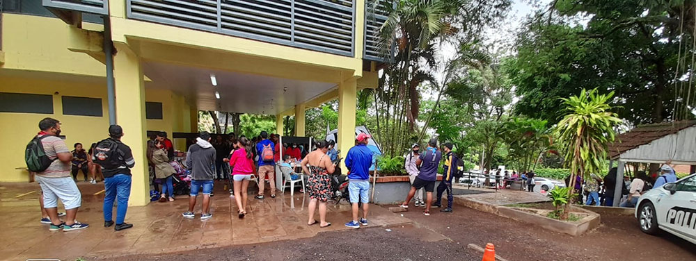 Unas 60 personas del Movimiento Madre Teresa Rodríguez (MTR) y de la CCC se manifiestan frente al Ministerio de Desarrollo Social, en el Centro Cívico de Posadas a la espera de una respuesta a sus pedidos.