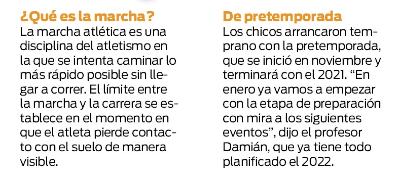 Hasta ahí ya era un año redondito. Pero llegó la Copa Nacional de Mayores en Rosario y Damián volvió a las pistas después de cuatro años y se quedó con la de plata en los 20k. A principios de noviembre, Geremías Rojas ganó la de plata en Córdoba, en el Nacional U-16 y la semana pasada, viajaron a Salta, al Nacional U-14 y se volvieron con dos de oro en Combo 4 (80 metros, salto en largo y 3 mil de marcha), ganados por Xiomara Duarte y Geremías. Para aplaudir.