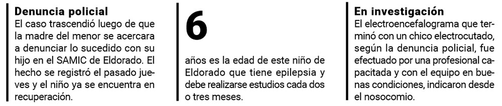 La madre de un niño de seis años denunció que en el Hospital SAMIC de Eldorado electrocutaron a su hijo mientras realizaban un estudio médico. Se trató de un paciente con epilepsia que debe hacerse estudios periódicamente, por lo cual concurrió al nosocomio el pasado jueves. Mientras preparaban para hacerle un electroencefalograma, la máquina emitió una descarga que afectó al niño. Por la gravedad de las quemaduras, el chico debió recibir atención quirúrgica en la cabeza.