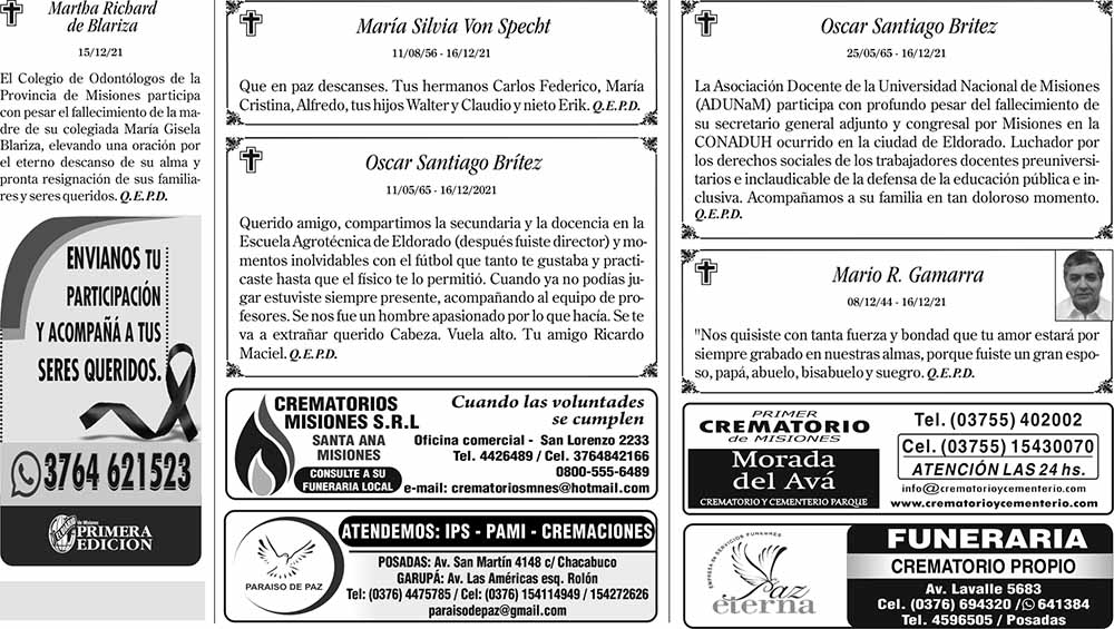 Fúnebres del viernes 17 de diciembre de 2021