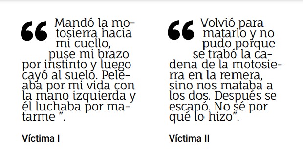 El relato del argentino de 57 años y suegro de la otra víctima fue coincidente. Declaró: “Me acerqué para que no lo mate a mi yerno y ahí me empezó a cortar los dos brazos con la motosierra. Me cortó el hueso del brazo derecho, los tendones del izquierdo, el pecho, la cara desde la nariz y me arrancó dos dientes. Volvió para matarlo pero se le trabó la motosierra. Ahora ambos luchamos por nuestras vidas. Yo no puedo trabajar más. No sé cómo voy a hacer para sobrevivir”. Ambas víctimas pidieron que se haga justicia