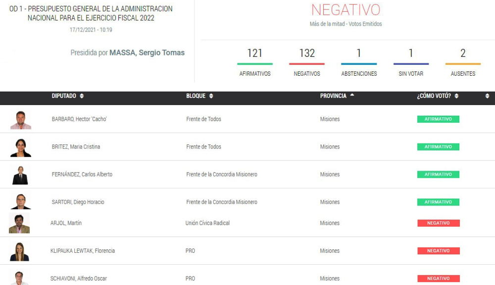La oposición sumó 132 votos negativos contra 121 del oficialismo, y una abstención. Y desde la provincia de Misiones votaron siete diputados: Héctor “Cacho” Bárbaro y Cristina Britez (Frente de Todos), Diego Sartori y Carlos Fernández (Frente Renovador); Martín Arjol (UCR), Florencia Klipauka y Alfredo Schiavoni (PRO).
