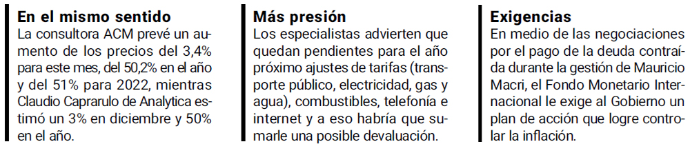 Hacia adelante, “se espera para 2022 un piso inflacionario de 50% (con riesgo al alza) en un contexto en que se esperan reacomodamientos tarifarios y una aceleración de la tasa de devaluación del tipo de cambio oficial”, según la consultora del exministro Dante Sica.