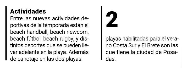 En el caso de los deportes acuáticos se dictarán clases de natación a partir de enero en las dos playas, aquagym y canotaje tanto en Costa Sur como en el Brete. “La gestión apostó por embarcaciones así que tenemos la posibilidad de ofrecer canotaje en las dos playas”, enfatizó Romero.