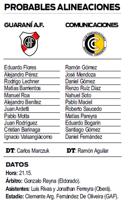 Guaraní Antonio Franco recibirá esta noche a Comunicaciones de Mercedes (Corrientes) en el marco de las revanchas de los octavos de final, etapa final para los equipos de la Región Litoral Norte.