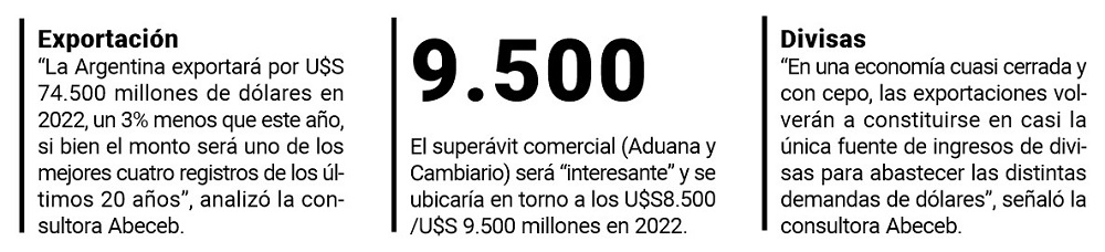 Ese superávit ya no será de cinco cifras como en el trienio 2019-2021, sino que se ubicaría en torno a los U$S 8.500 /U$S 9.500 millones en 2022.