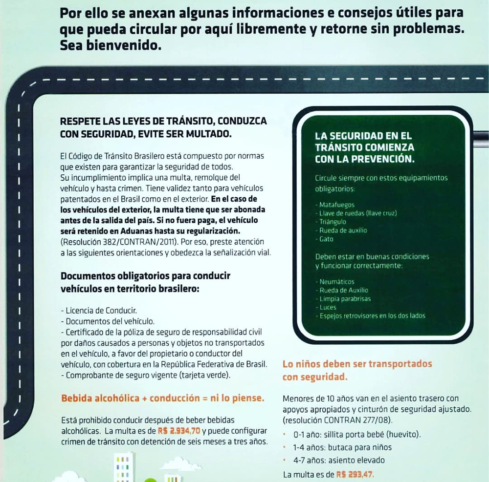 Otra cuestión muy importante es que para circular por el vecino país el conductor debe tener a mano: licencia de conducir; documentos del vehículo; certificado de la póliza de seguro con cobertura en la República Federativa de Brasil; y comprobante de seguro vigente (tarjeta verde).