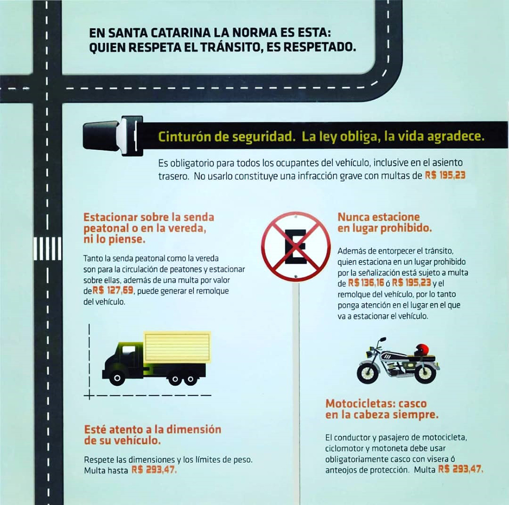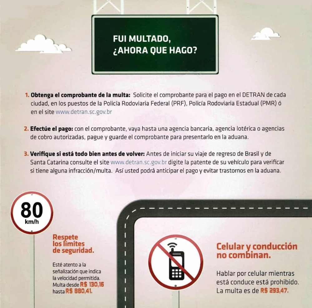 Antes de iniciar su viaje de regreso de Brasil y de Santa Catarina consulte nuevamente en www.detran.sc.gov.br la patente de su vehículo para verificar si tiene alguna infracción/multa. Así usted podrá anticipar el pago y evitar trastornos en la aduana.